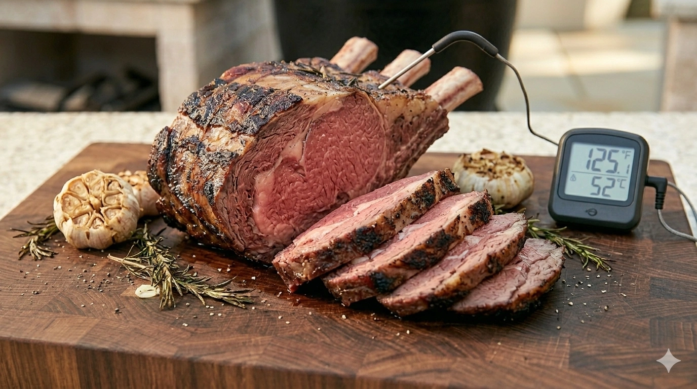 The roast continues to cook during the rest period and the final sear. Pulling at 118°F gives you a finished temperature of approximately 130 to 132°F — the ideal medium rare window for standing rib roast.